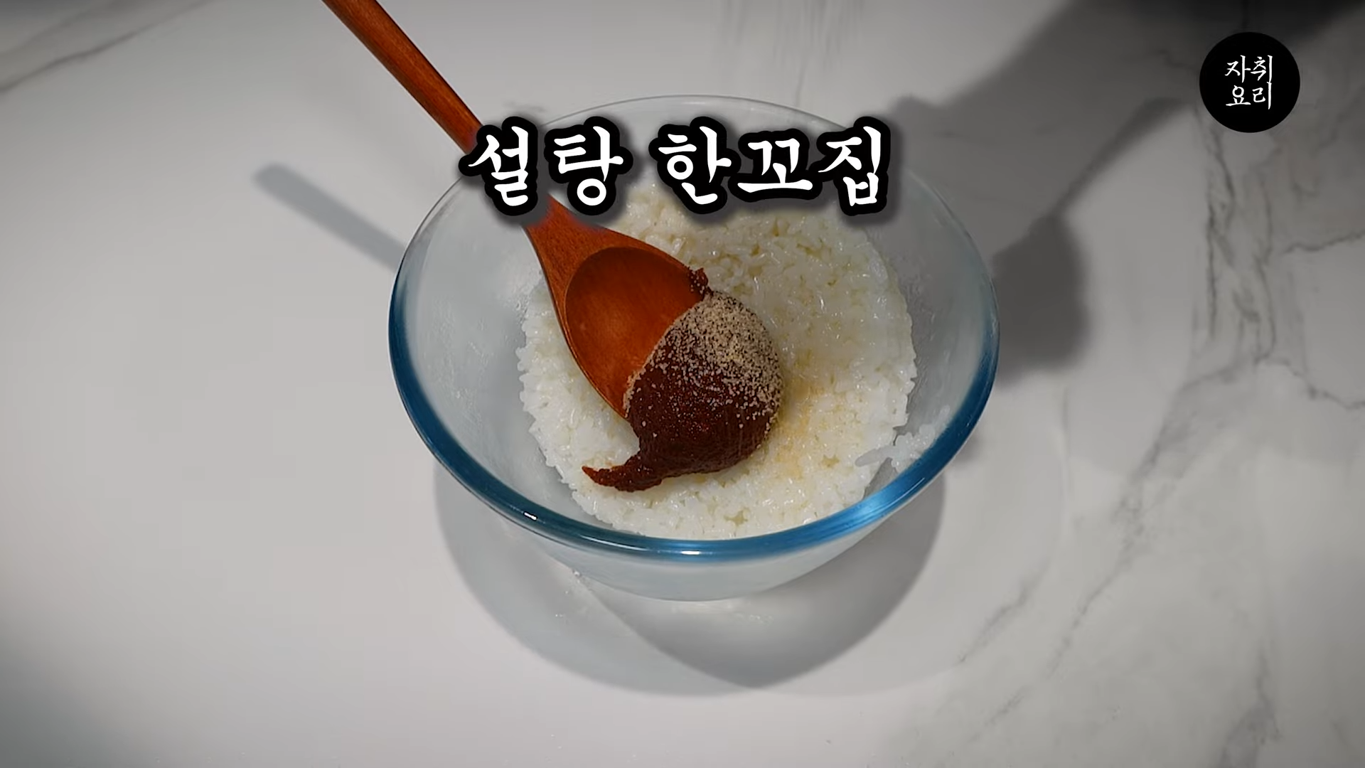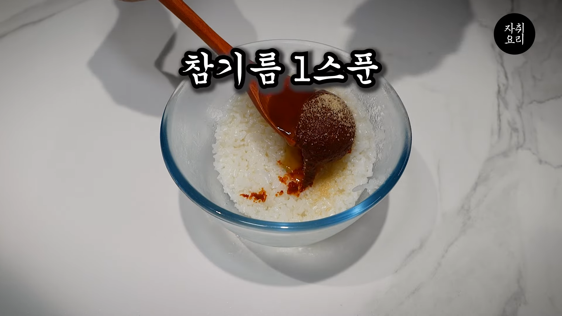 1. 뜨거운 열기를 뺀 밥 1공기에 고추장 1/2스푼, 설탕 1꼬집, 참기름 1스푼을 넣고 비벼줍니다.