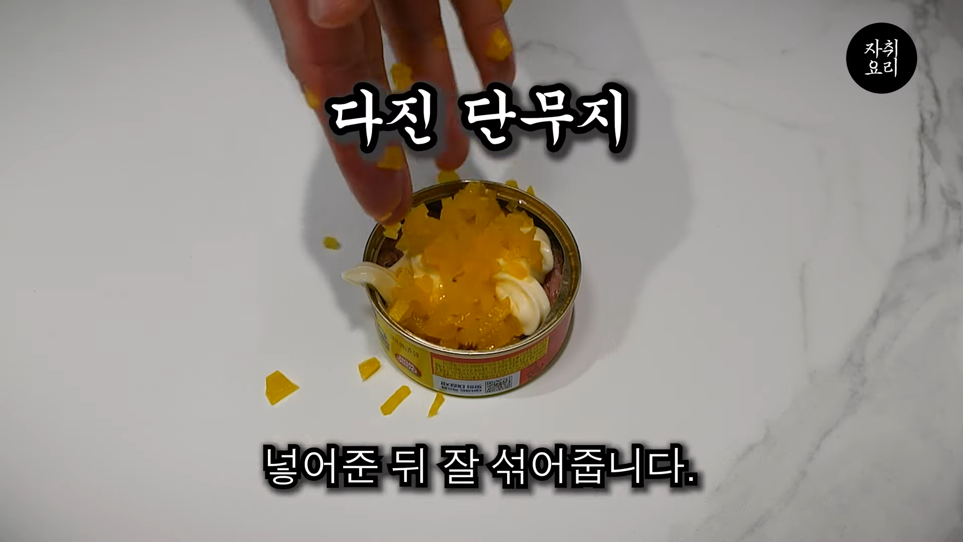 2. 기름을 뺀 참치에 마요네즈 2스푼, 다진 단무지를 넣고 섞어줍니다