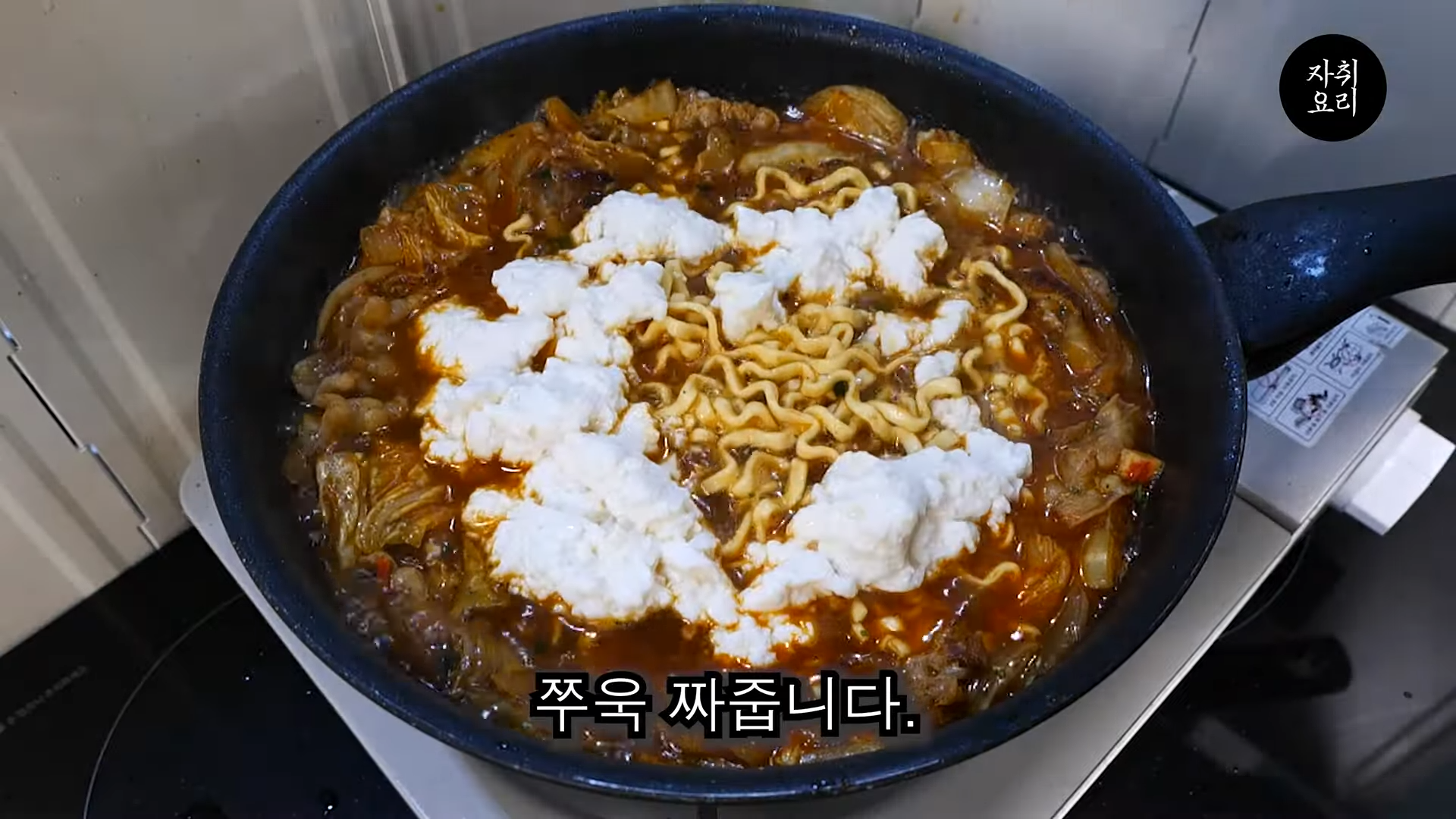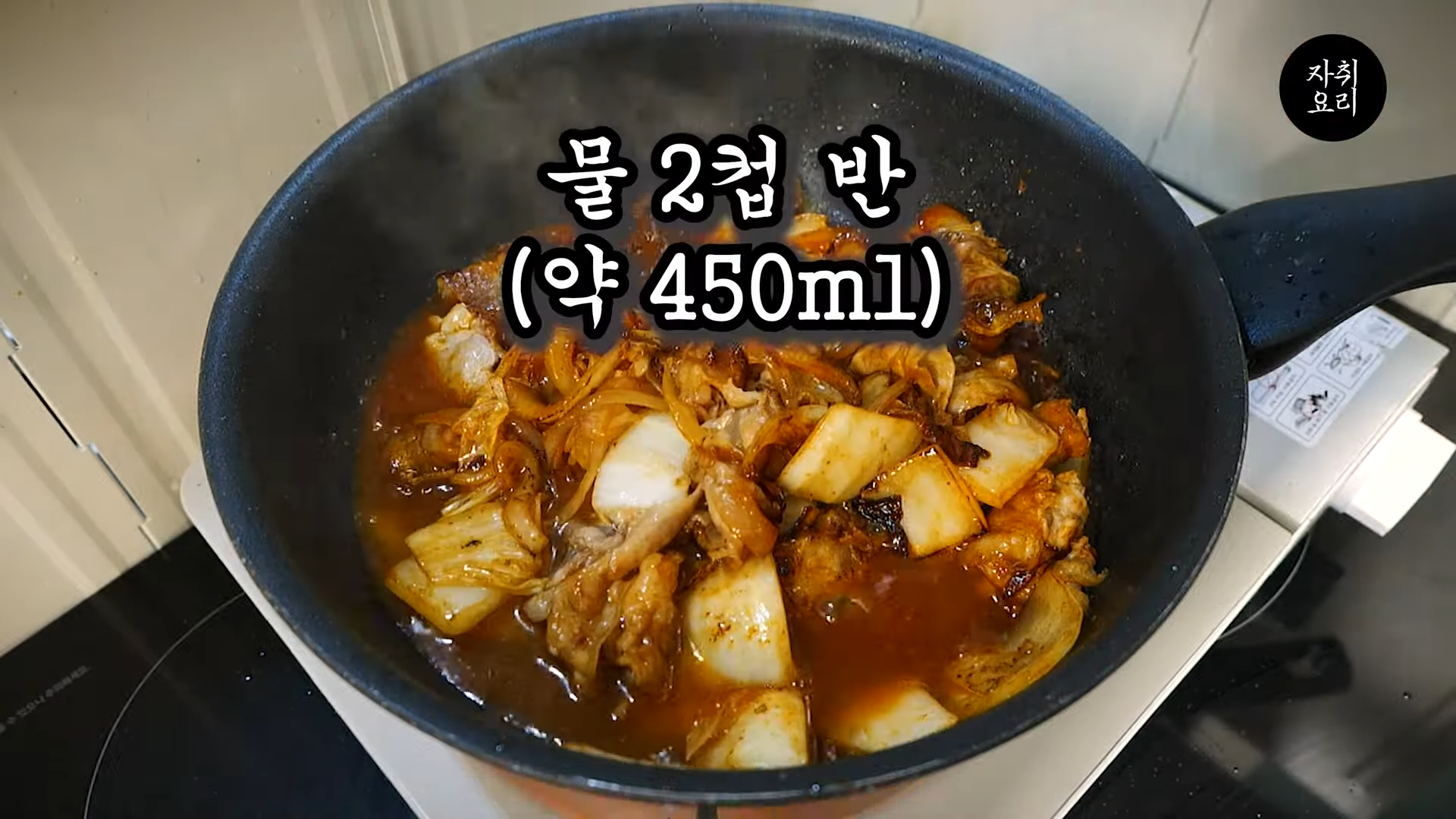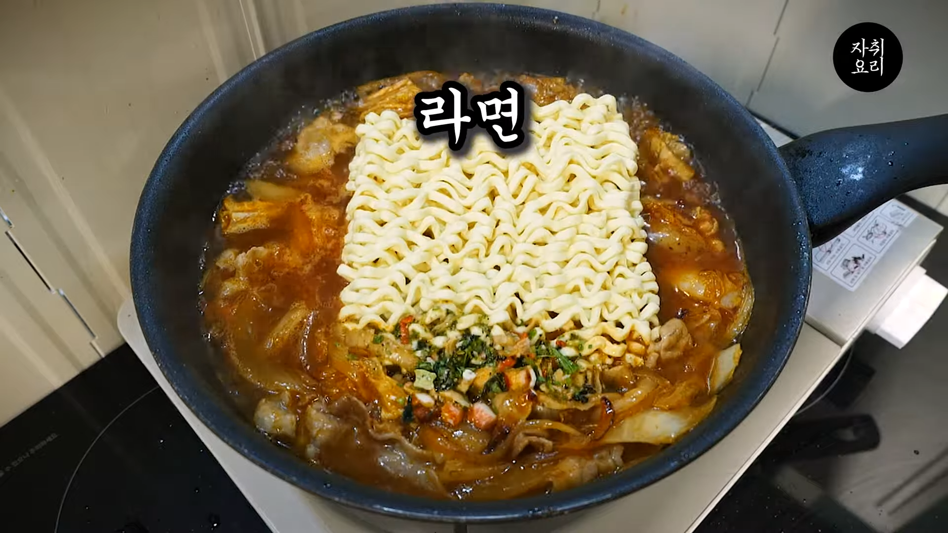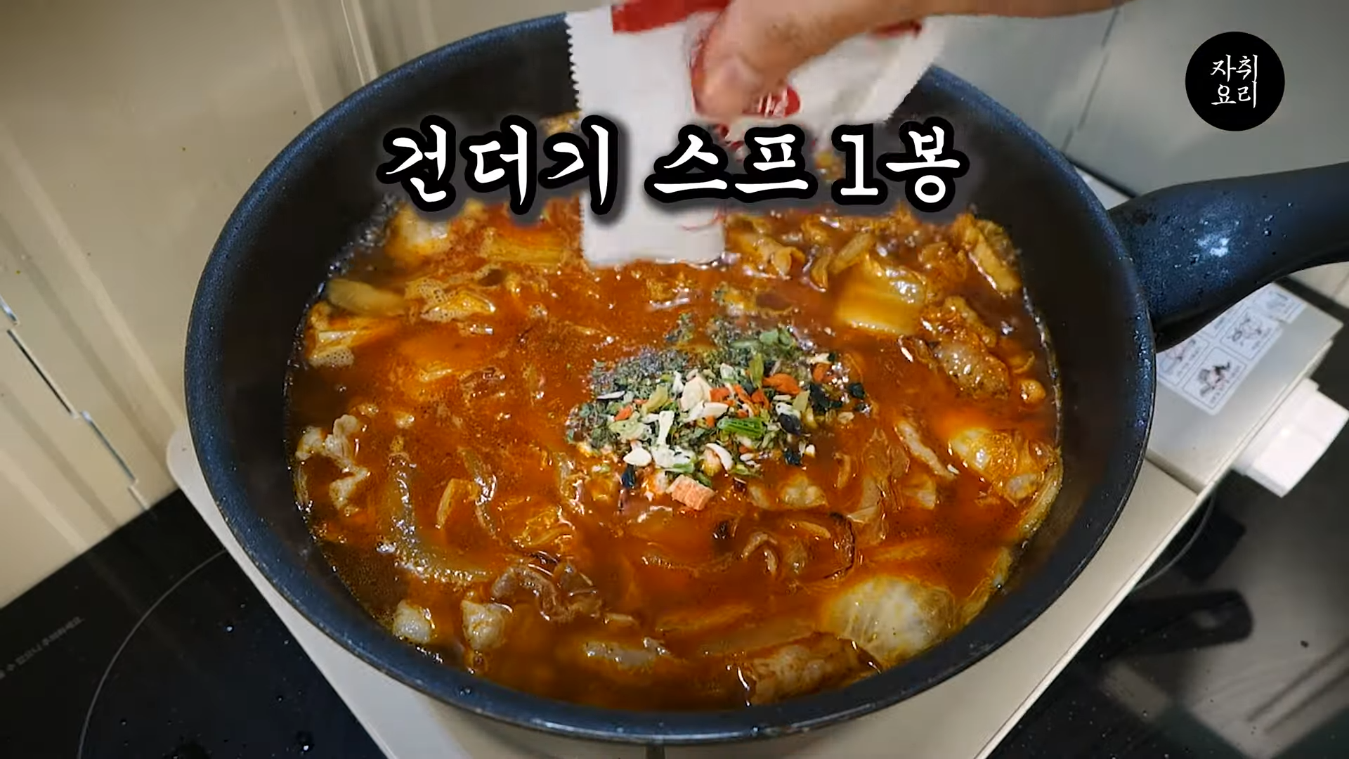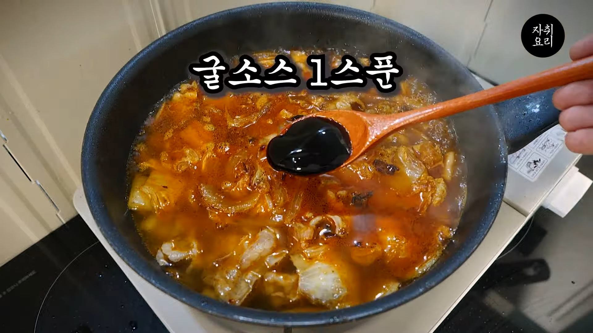 3. 물 2컵반(약 450ml), 굴소스 1스푼, 건더기 스프, 면을 넣고 익혀줍니다.