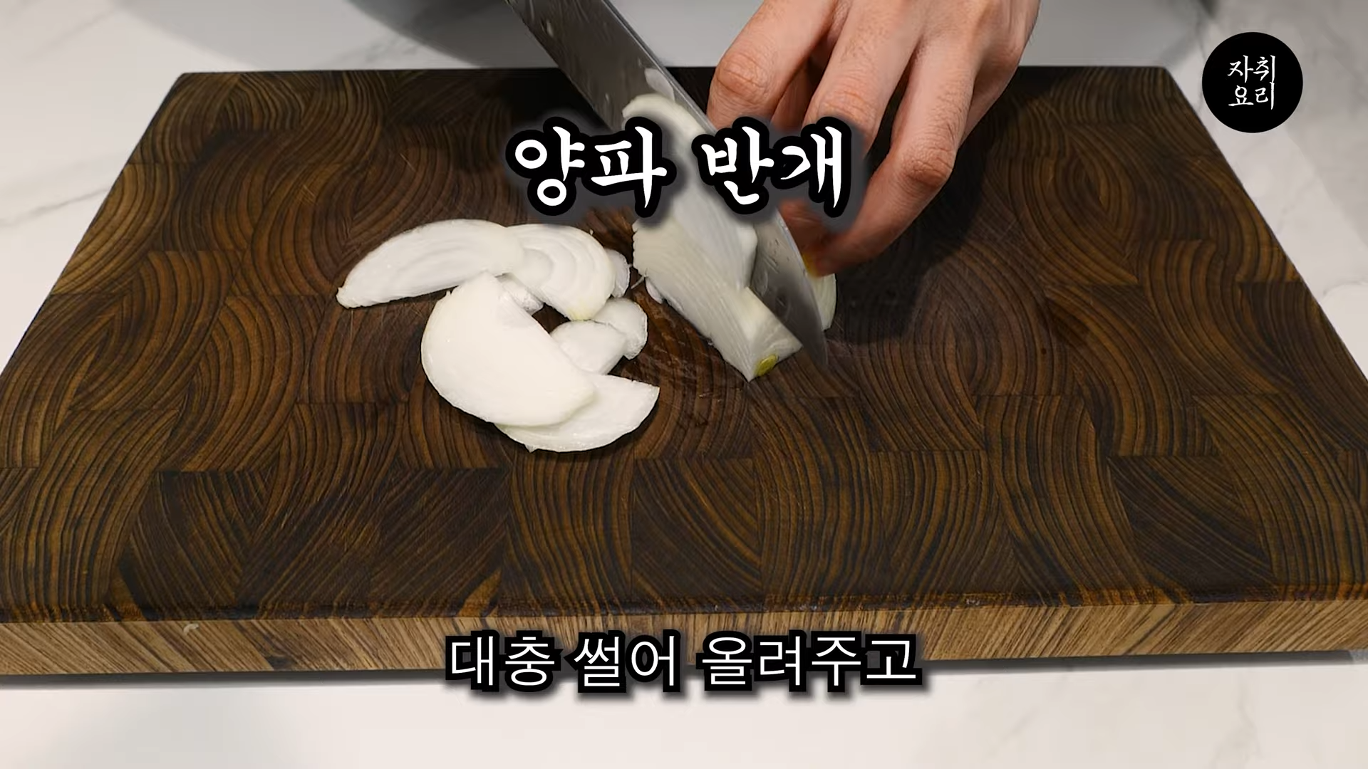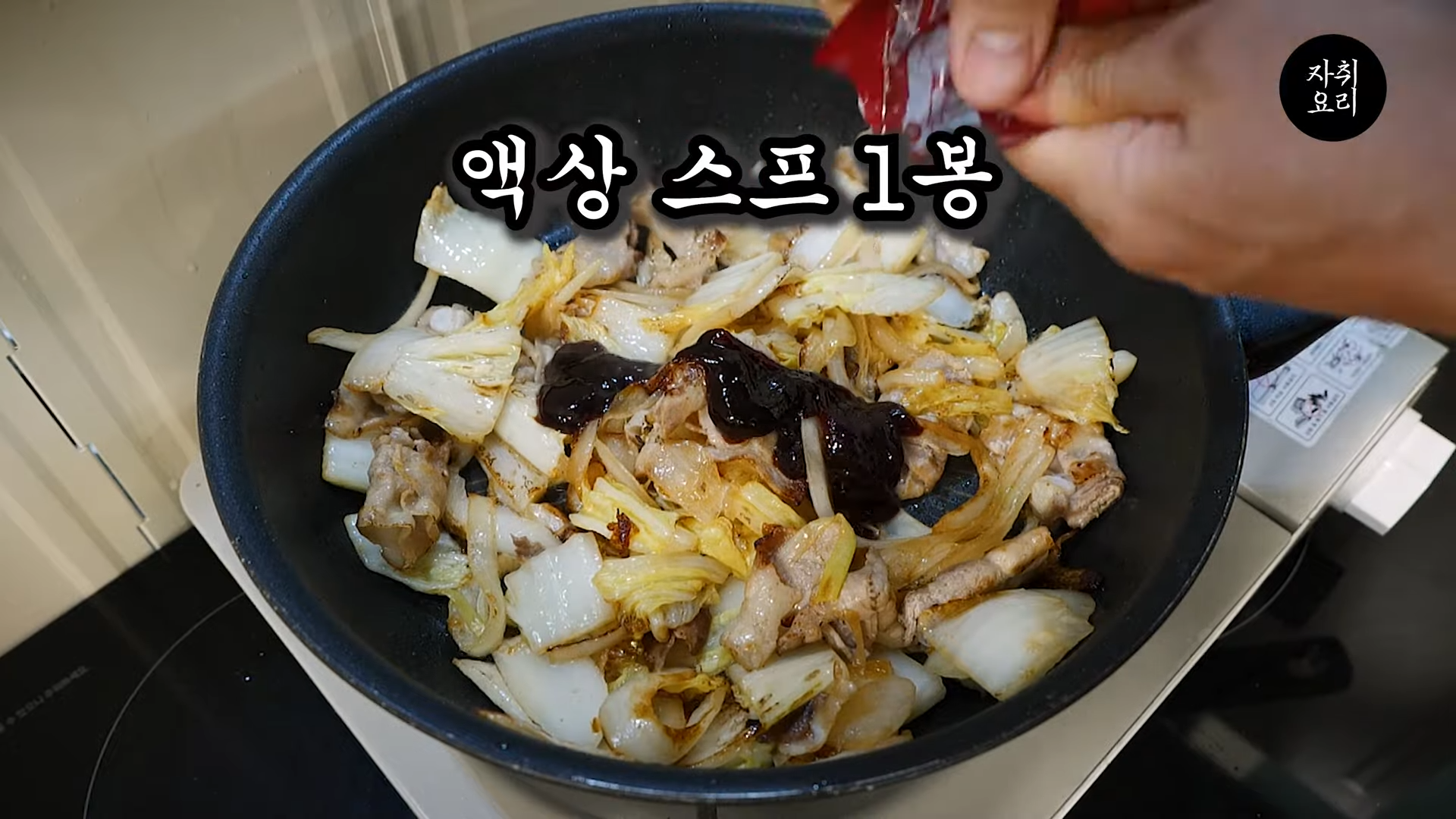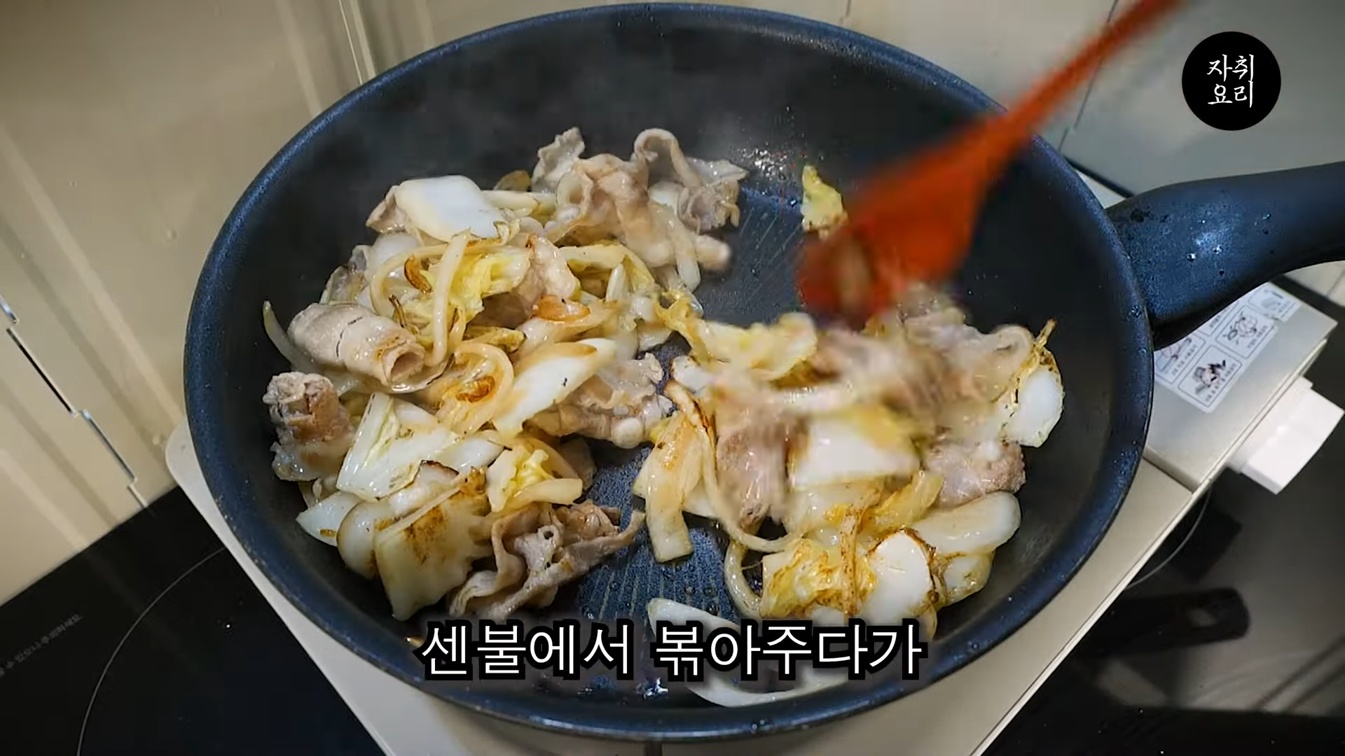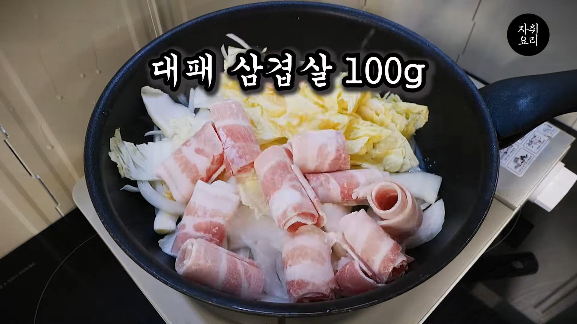 1. 팬에 양파, 알배추, 대패삼겹살 100g을 볶아줍니다.