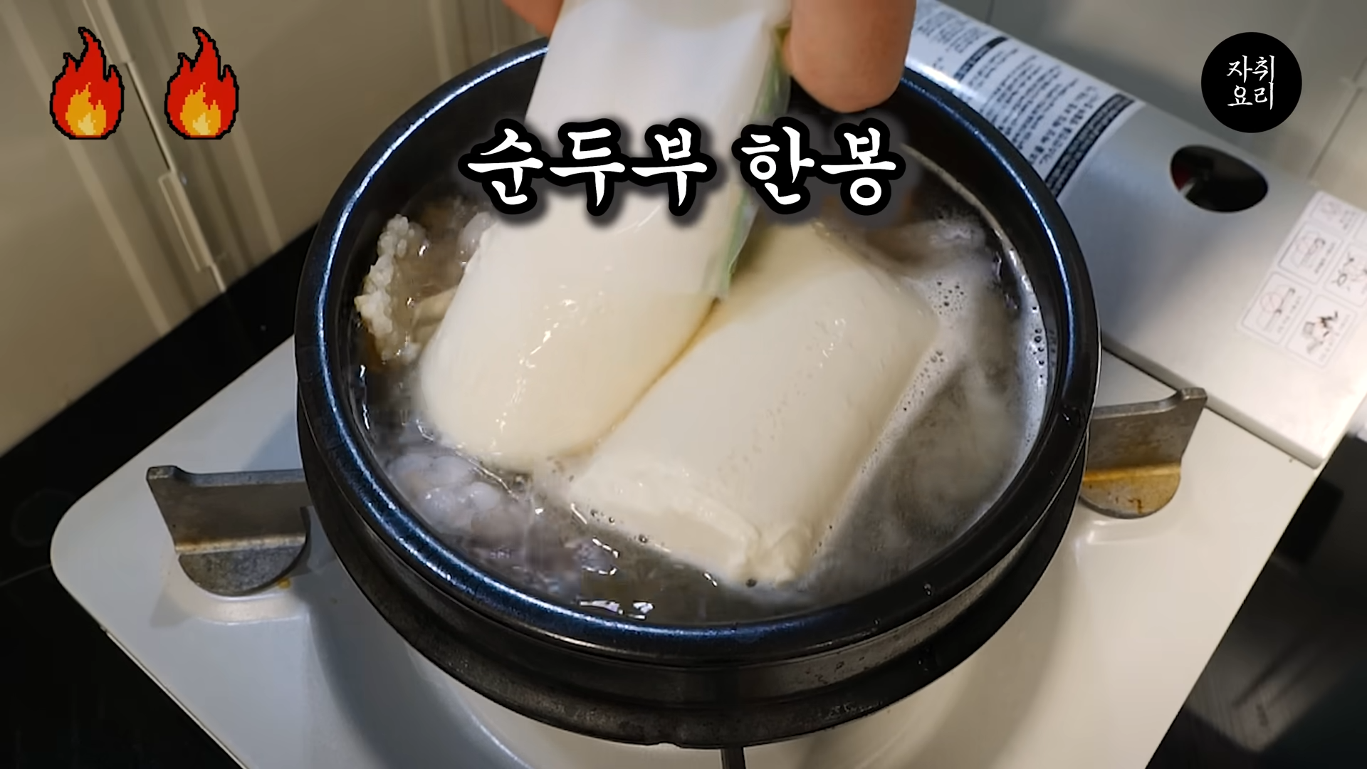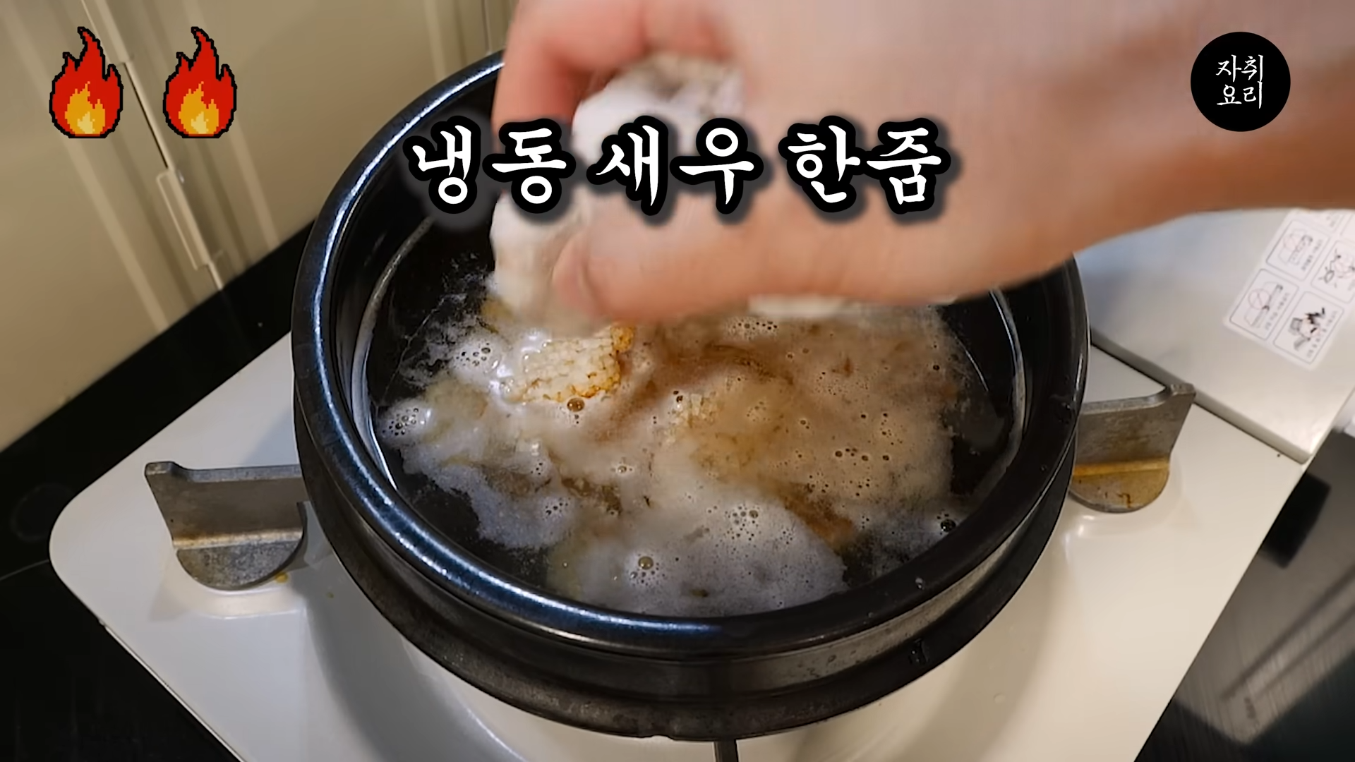 1. 뚝배기나 냄비에 물 2컵(약 360ml), 치킨스톡 1/3스푼, 멸치 액젓 1스푼, 누룽지, 냉동 새우 한줌, 순두부 한봉을 넣고 끓여줍니다.