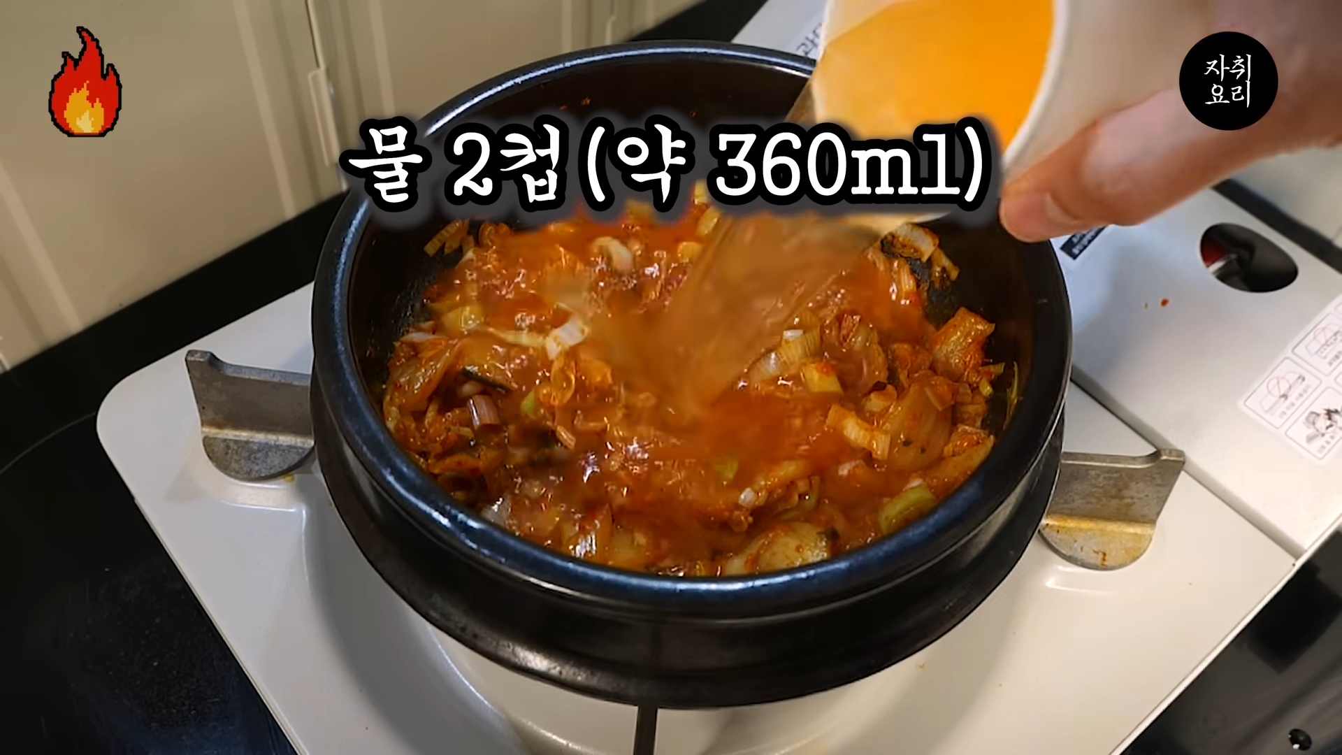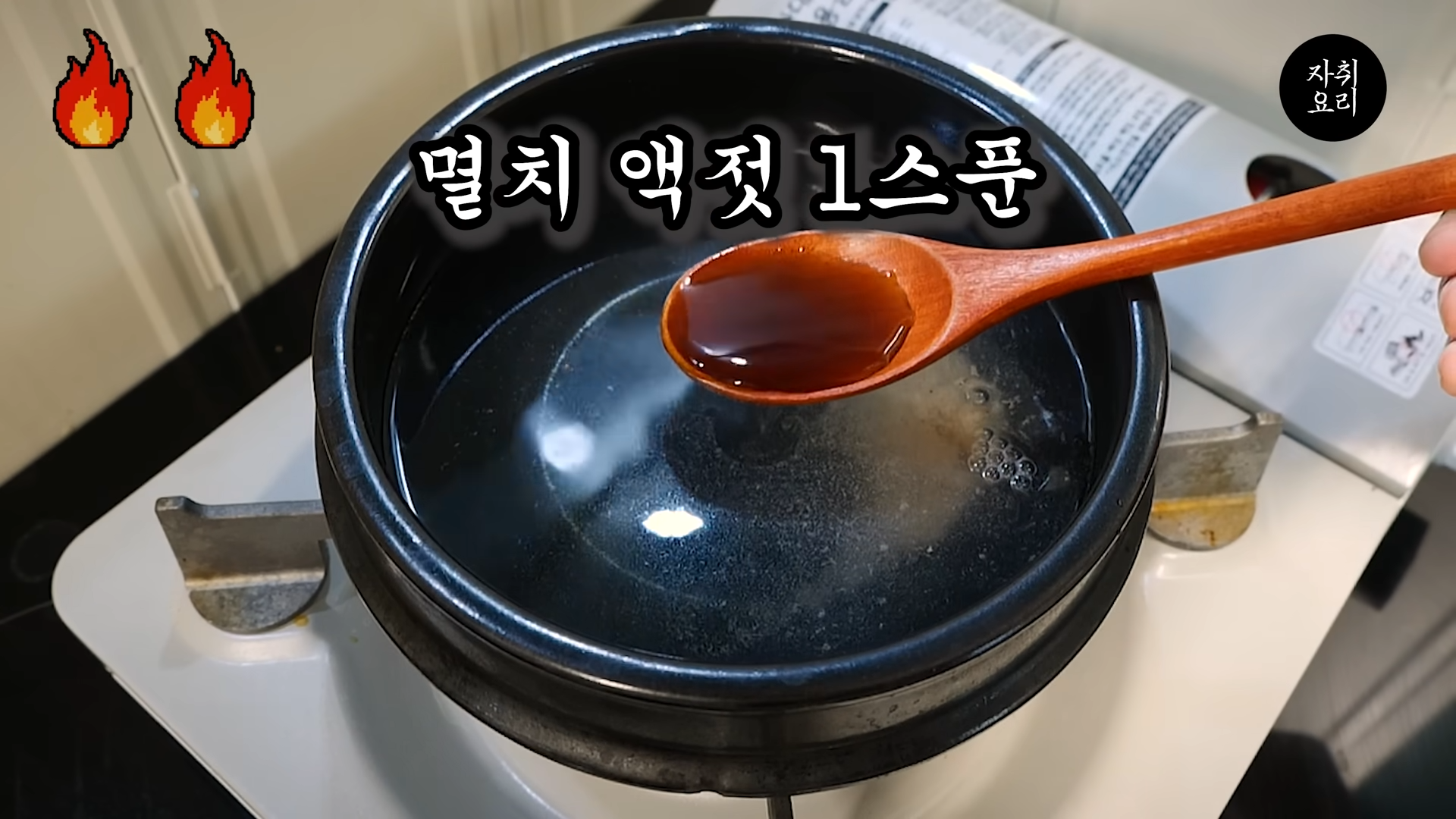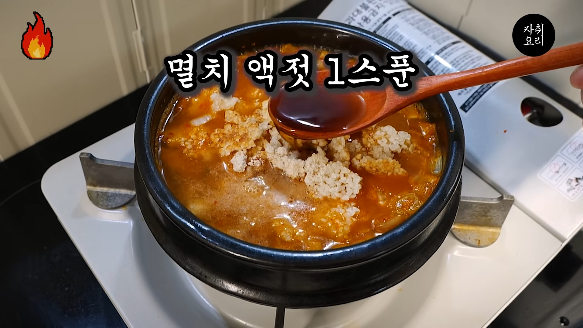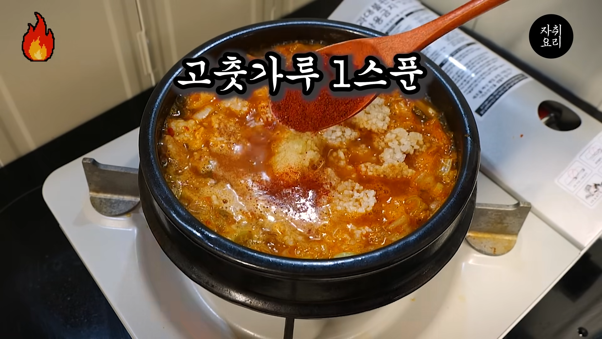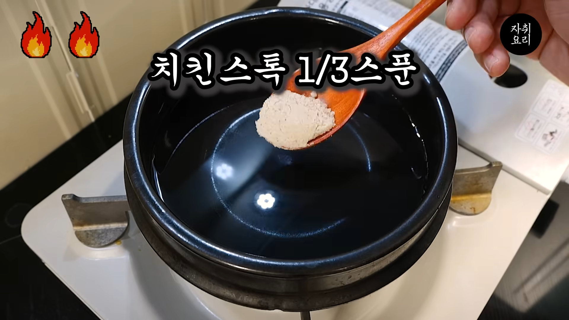 2. 물 2컵 (약 360ml), 치킨스톡 1/4스푼, 멸치액젓 1스푼, 다진 마늘 1/3스푼, 고춧가루 1스푼, 누룽지를 넣고 끓여줍니다.
