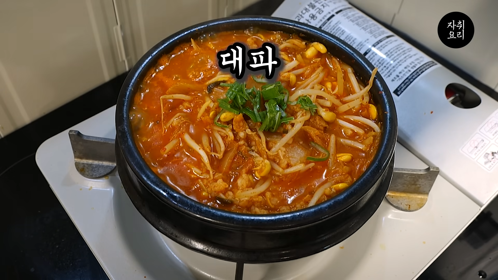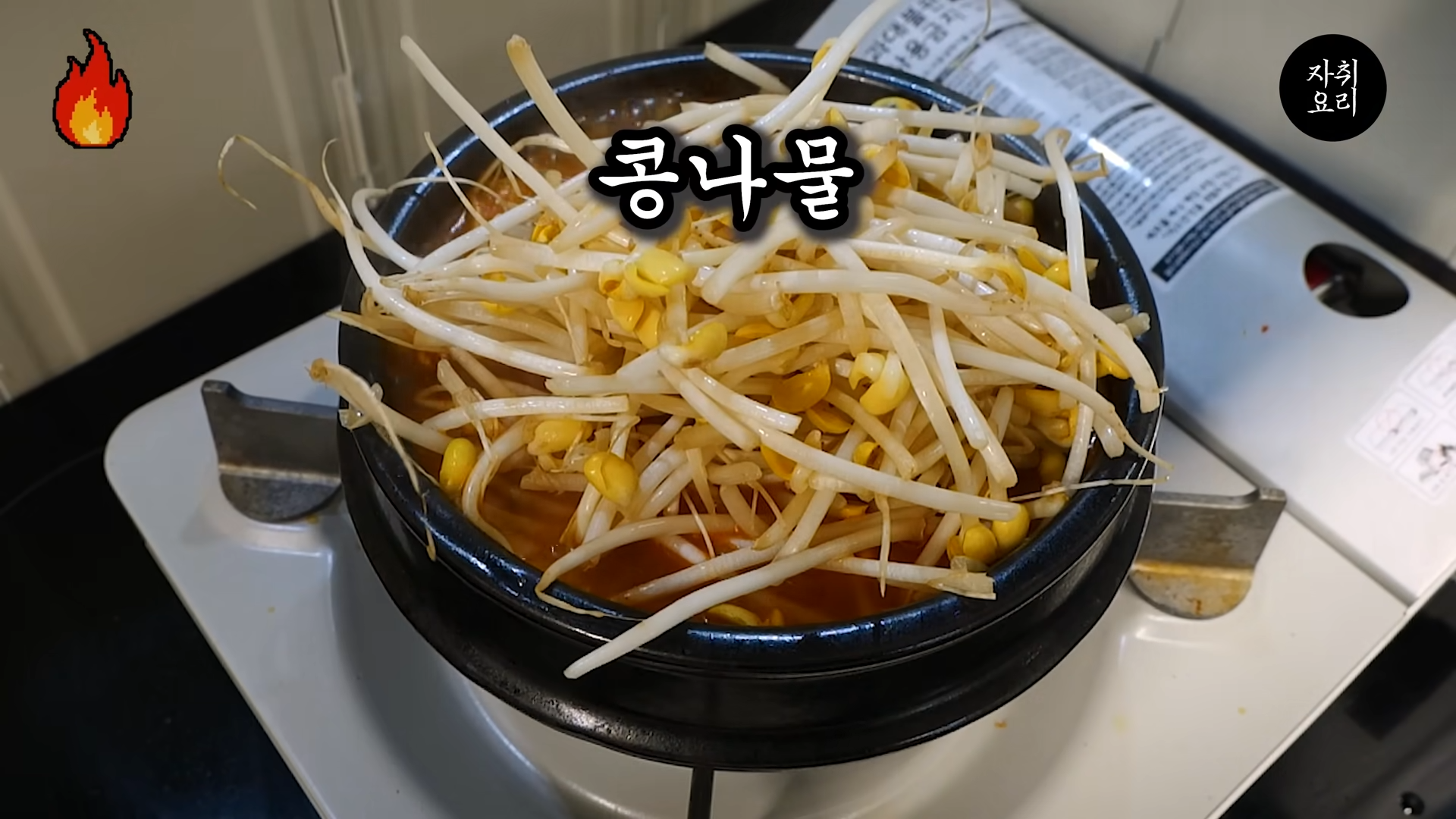 3. 콩나물 한줌을 넣고 숨을 죽여주고 대파를 올려 마무리합니다.