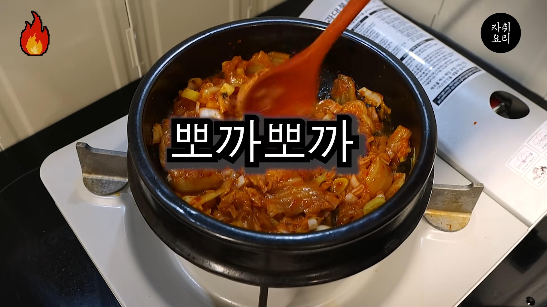 1. 뚝배기에 식용유를 두르고 다진 대파, 자른 김치 1컵을 볶아줍니다.